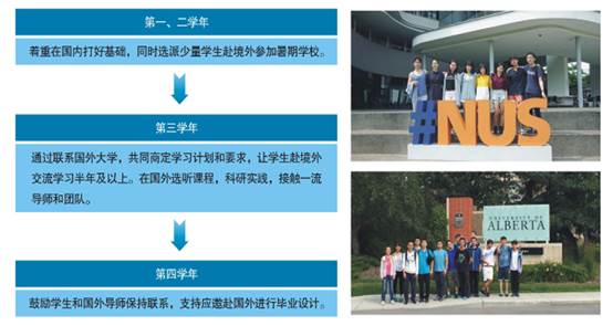 国际化培养拓展视野:采取“三段式”国内外合作培养方式。2012年起,学院先后与国际知名大学签订合作备忘录,每年遴选优秀拔尖学生赴外交流学习。同时,学院先后邀请146位国际、国内知名院士、专家学者来访授课或开设专题讲座,开拓学生视野,了解国际学术前沿。